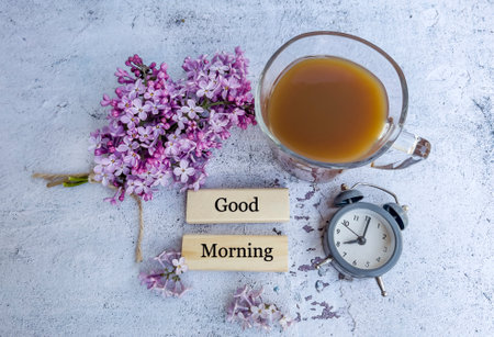 Cup of tea with lilac flowers and wooden blocks with the inscription Good morning