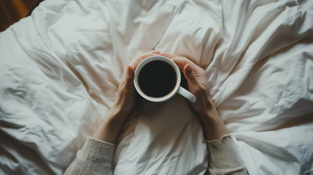 Cozy morning routine with a warm cup of coffee while relaxing in soft bedding