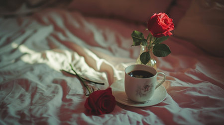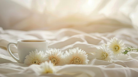 Coffee cup and chrysanthemum bouquet, A tranquil morning setup in bed. Ai Generated