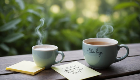 This image was generated using AI. Coffee cups rest on a wooden table next to handwritten notes that evoke affection, care, and emotional connection. The warm and intimate composition conveys a gesture of everyday kindness, ideal for campaigns about emotional health, human connection, and shared moments. Perfect for editorial, social, and commercial content that promotes empathy and well-being.