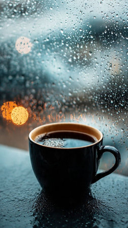 Man looking out of a foggy window, clutching a steaming mug, blurred city lights in the background, generative ai