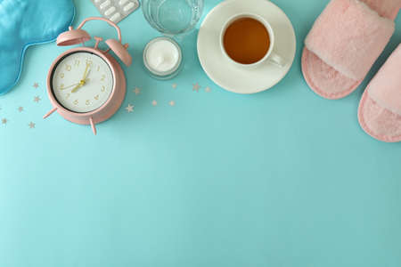 Female sleep routine accessories on blue background