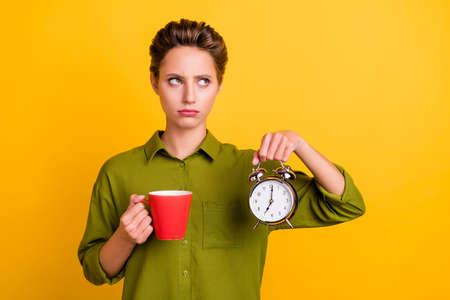Photo of bored exhausted lady hold cup clock look empty space wear green shirt isolated yellow color background