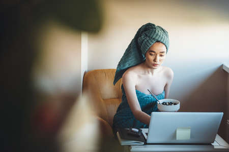 Young fitness lady sitting at the computer after shower and eating cereals with a towel on head