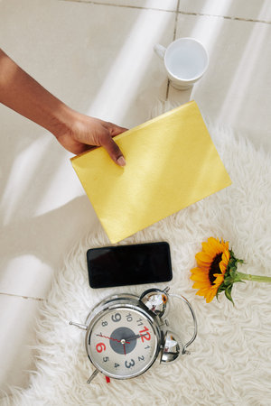 Hand of woman putting book next to smartphone and alarm clock, view from above