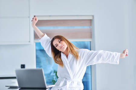 woman wearing a white bathrobe with laptop