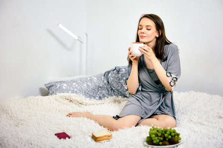 Coffee in morning in bed by woman 20 years old in bathrobe.