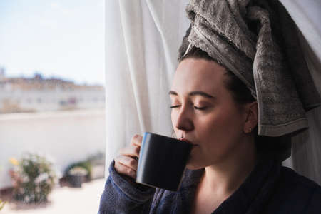 Girl having a cup of coffee after a shower in front of a window with white curtains