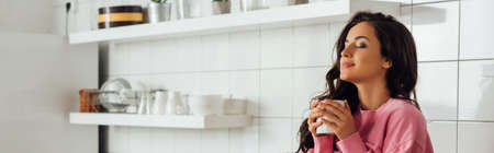 Panoramic shot of beautiful girl with closed eyes holding cup of coffee in kitchen
