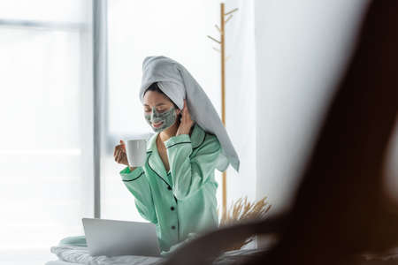 smiling asian woman in pajamas and clay mask sitting with cup of tea near laptop in bedroom