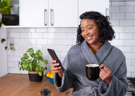Attractive young girl in bathrobe using smart phone, holding a white cup