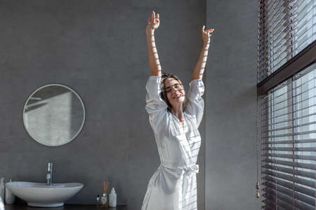 Beautiful Young Woman Wearing White Silk Robe Stretching In Modern Bathroom