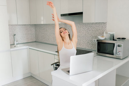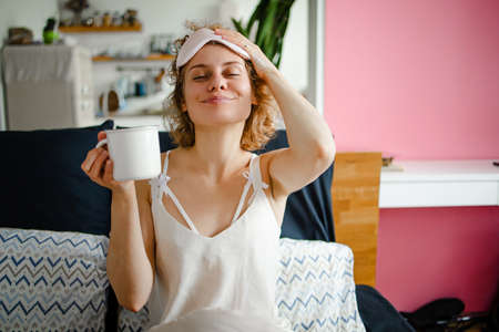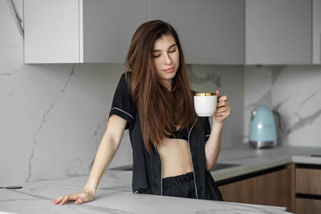 Beautiful relaxed young female in cozy silk pajama stretching from night sleep waking up early in morning with cup of coffee in her hand while standing in stylish kitchen interior at home