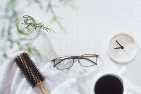 Time to get ready in the morning, take a break, relax, glasses, coffee and a watch.