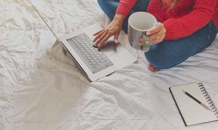 concept of working at home with woman using laptop on bed
