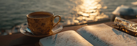Enjoying a moment of journaling with a warm cup of coffee during golden hour, reflecting on thoughts by the serene waterside.