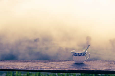 Close up cup of coffee on wooden balcony railing over blurry mountain background Pha Chang Noi, Phayao province, Thailand.