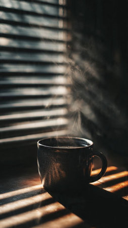 Coffee cup on the windowsill with blinds and sunlight