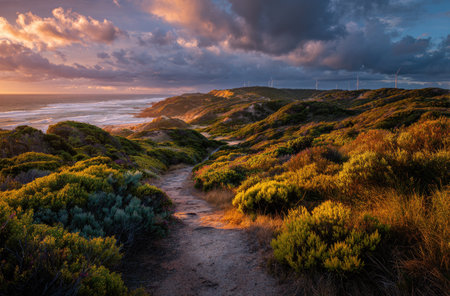 A scenic landscape showcases a winding path leading through rolling hills, covered in lush green vegetation. The composition is bathed in the warm light of a setting sun, highlighting the textures and colors of the terrain. The dramatic sky with dark clouds adds to the atmosphere. Suitable for various commercial and editorial applications.