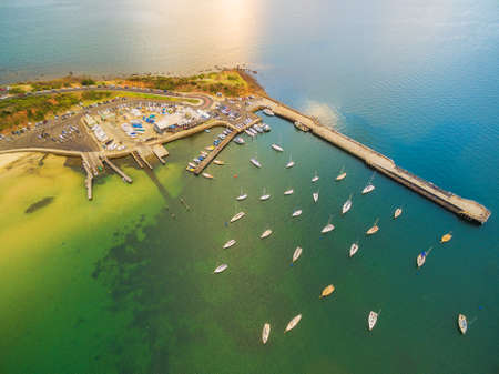 Aerial landscape of Sorrento suburb coastline with private piers and moored boats at sunrise. Mornington Peninsula, Melbourne, Australia