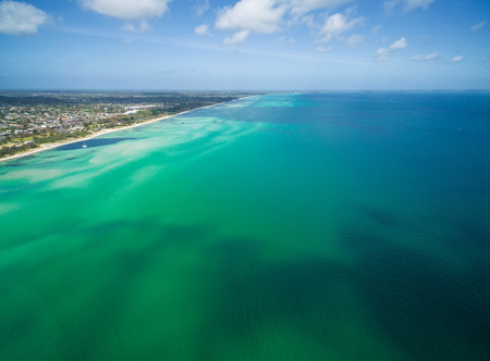 Aerial view of coastline near Rosebud suburb and vivid turquoise bay water. Mornington Peninsula, Melbourne, Australia