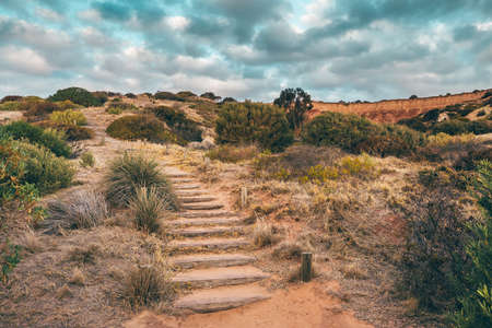 Historical Hallett Cove wooden uphill trail at sunset, South Australia