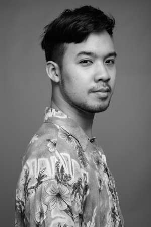 Portrait of young Asian man against gray background