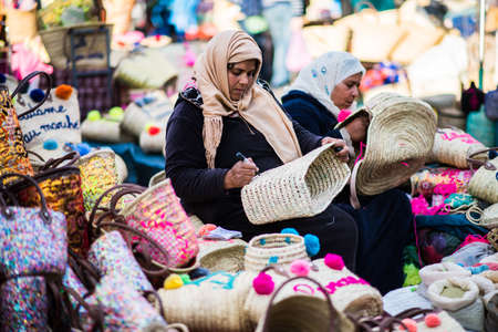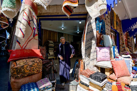 Essaouira, Morocco, Feb 2019: Man vendor selling Moroccan handmade textiles, carpets. Moroccan old town medina