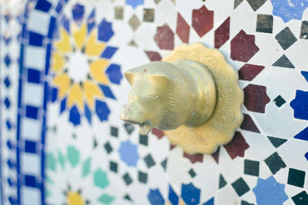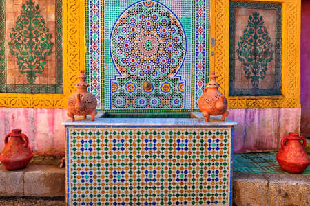 Inner courtyard with clay lamps and vases and gorgeous mediterranean mosaic in the city of Fes in Morocco, Northern Africa