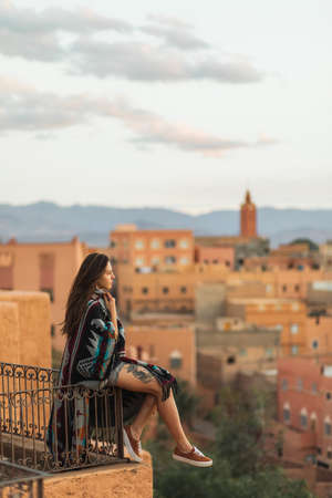 Woman sitting on roof terrace with aerial view of old arabian town Boumalne. Covered with traditional moroccan cape. Hippie style, tattoo on leg.