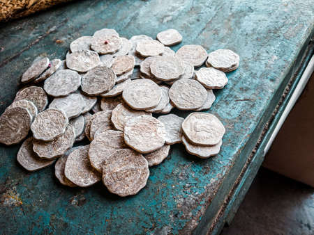 Ancient silver coins on a dark wooden background. Selective focus.