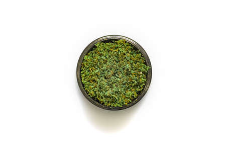 Kief in grinder for weed macro top view isolated on white backgrou