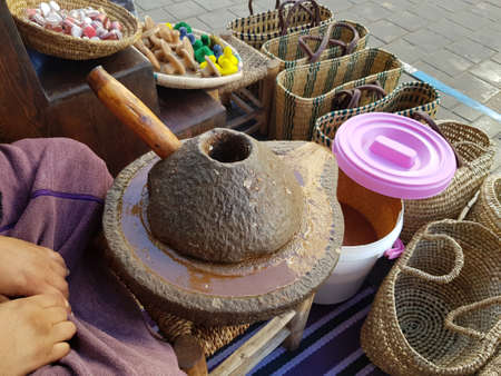 In the center of composition is a stone press for argan oil production. One can see the hands of a woman who manufactures argan oil. Wicker baskets, souvenir jars fringed the photo.
