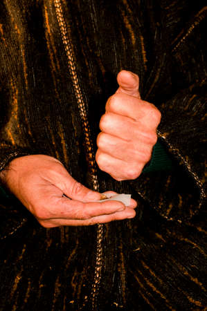 man hands with dark green djellaba, cigar in hand, prepares hashish cigar with white smoking paper, hashish cigar preparation