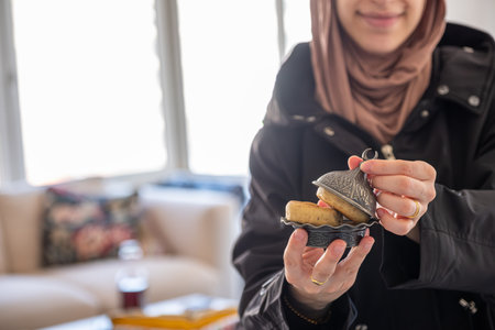 muslim Female hands holding eid sweets in home with smile on her face