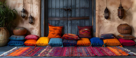 Traditional arabic sitting room with colorful geometric cushions and rugs in old mud house, showing heritage woven wall decor.