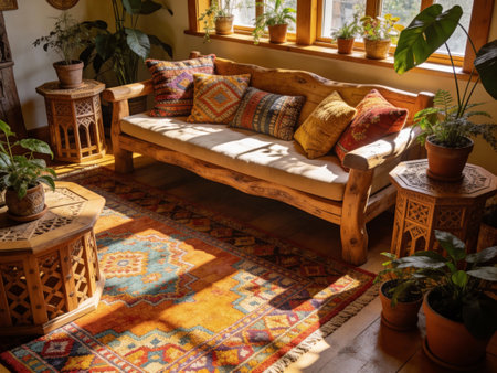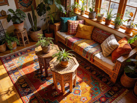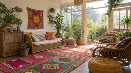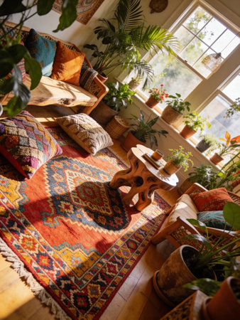 A bohemian-inspired living room with colorful cushions, woven rugs, and houseplants, offering a relaxed and eclectic vibe.