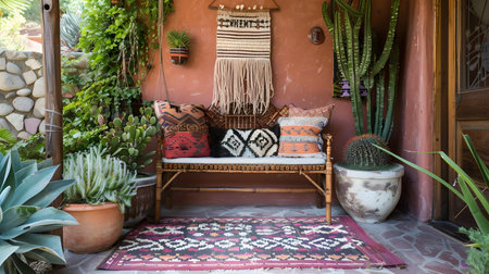 This image depicts a charming and inviting outdoor patio space with a bohemian-inspired aesthetic The patio features a wooden bench adorned with vibrant,patterned cushions and pillows,creating a cozy