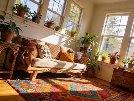 Cozy interior with plants and a colorful rug, creating a fresh and inviting atmosphere in a modern living space