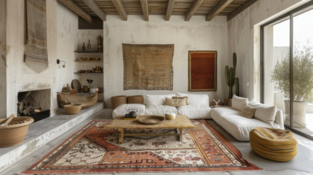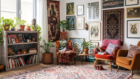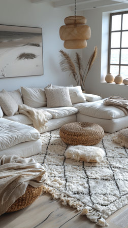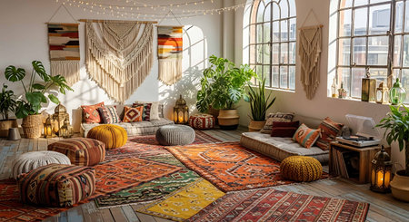 Stylish modern living room with bohemian decor and comfortable seating arrangement