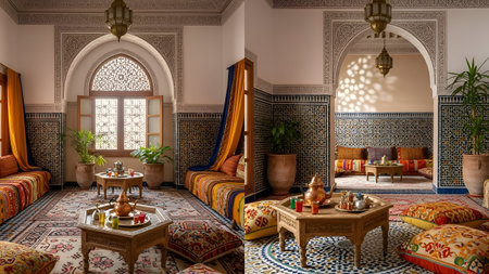A beautifully decorated Moroccan living room featuring intricate tile work, plush seating, and traditional lanterns.