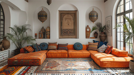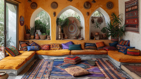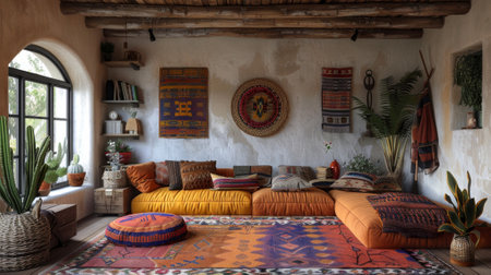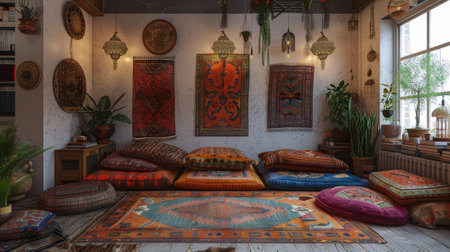 Step into a bohemian paradise with this colorful and eclectic living room. The furniture is designed for comfort with low-to-the-ground seating, plush floor cushions, and a Moroccan-style pouf.