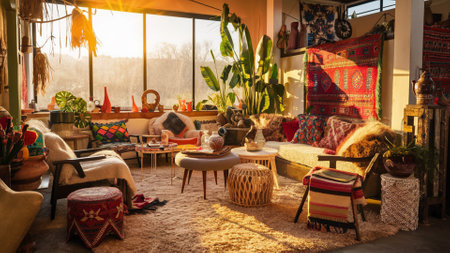 bohemian home decor, a lively bohemian living space adorned with vibrant textiles, warm earthy hues, and diverse cultural elements for a snug and inviting ambiance