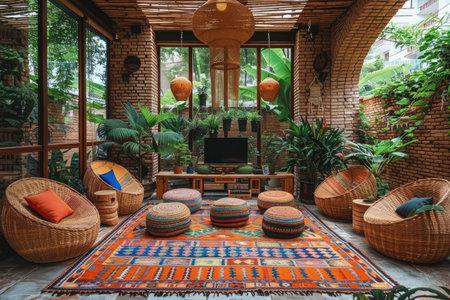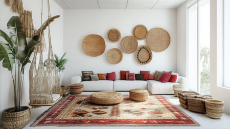 Interior design of Living Room in Bohemian style with Gallery Wall decorated with Woven Poufs, Macrame material. Contemporary architecture. Generative AI AIG24.