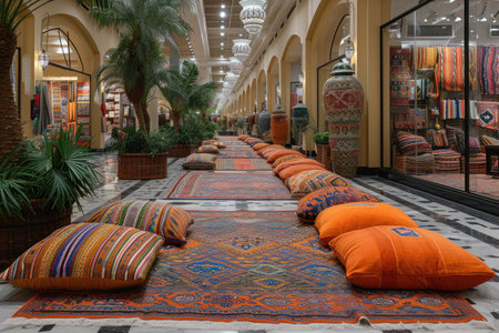 Explore a vibrant marketplace featuring an array of colorful rugs and textiles. The warm ambiance captures the essence of local craftsmanship and culture.
