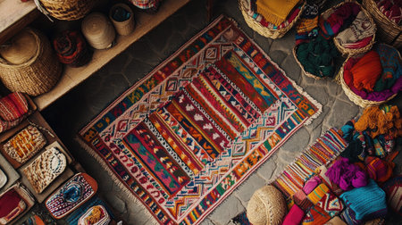 Discover the beauty of vibrant textiles and intricate patterns showcased from above in a traditional craft setting, highlighting cultural artistry.