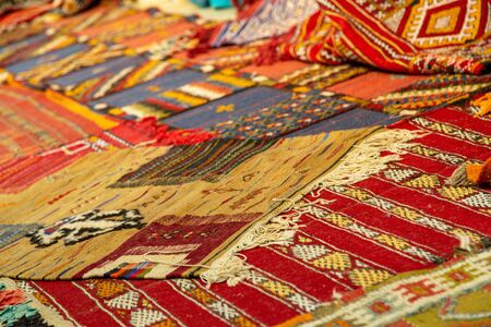 closeup of assortment of Moroccan carpets resting on the ground in a souk