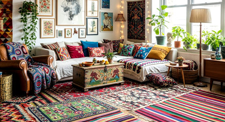 bohemian interior design, create a warm and inviting bohemian living room with vibrant textiles, earthy hues, and a blend of cultural elements for a cozy feel
