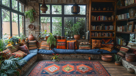 This enchanting bohemian corner is a serene retreat, adorned with earthy tones, a variety of textured cushions, and an abundance of potted plants by the window.