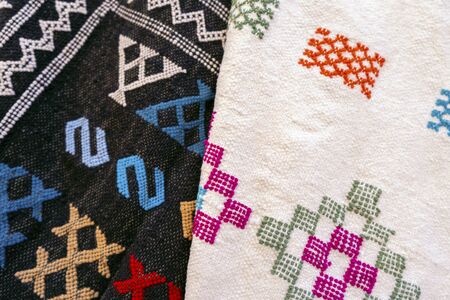 Handmade and ornamental carpet with traditional elements on wall at authentic city market